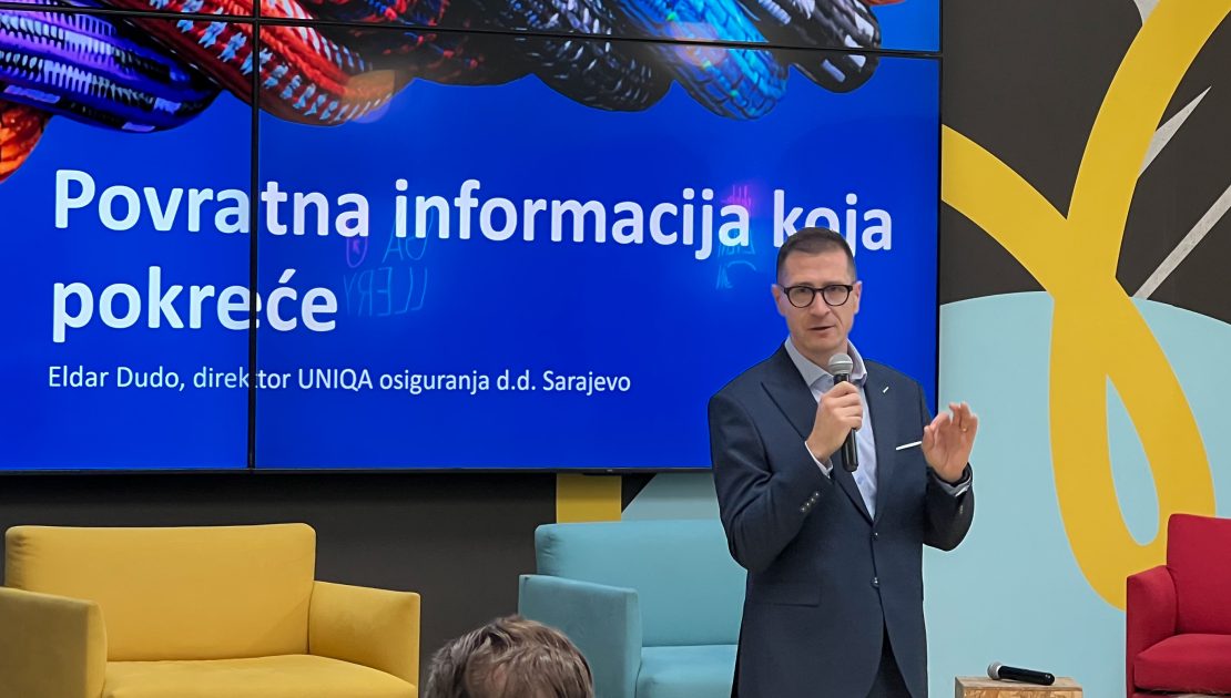 Sesiju pod nazivom „Povratna informacija koja pokreće“ realizovao je tim iz UNIQA osiguranja, kroz spoj teorijskih okvira i primjera iz svakodnevne poslovne prakse. Eldar Dudo, Alma Hodžić, Jasmin Kukuljac i Nerma Vukasović podijelili su iskustva o tome kako izgleda liderstvo u realnim situacijama – kada je potrebno voditi otvorene razgovore, prepoznati greške kao priliku za učenje i koristiti povratnu informaciju kao alat za razvoj, a ne kao mehanizam kontrole. Poseban naglasak stavljen je na činjenicu da se u UNIQA osiguranju kultura feedbacka gradi sistematski: kroz redovne razgovore između lidera i timova, kao i kroz godišnje ankete o zadovoljstvu zaposlenika koje omogućavaju rukovodiocima da bolje razumiju potrebe i očekivanja svojih ljudi.